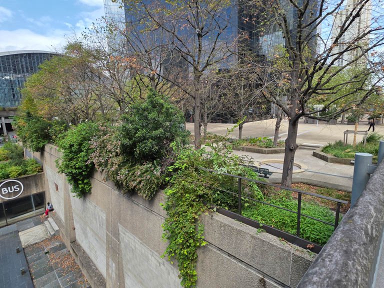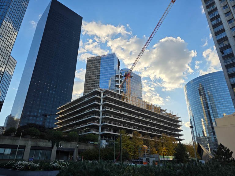 Pour aller de la rue Henri Régnault à la place de la Coupole Jean Millier, il faut emprunter un escalier en béton puis un escalier de chantier. Avant 2010, ce second escalier n’était pas nécessaire pour accéder aux Tours Total, Areva et SGAM (CB3) ou encore à la gare. On pouvait le faire en passant par la galerie commerciale, dont on devine à peine l’entrée derrière l’escalier.
